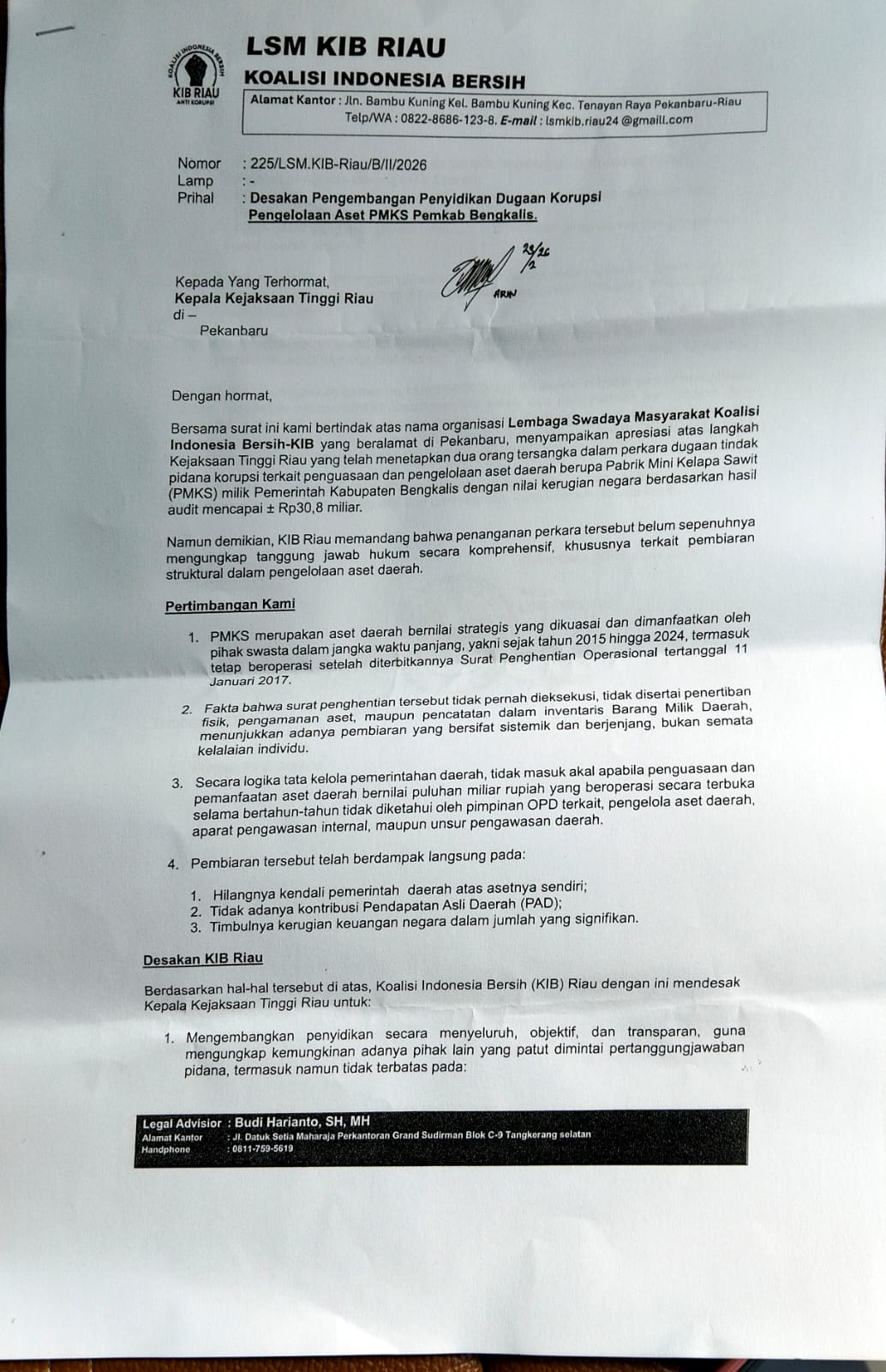 Nusaperdana.com,Bengkalis--Lembaga Swadaya Masyarakat Koalisi Indonesia Bersih (KIB) Riau resmi melayangkan surat desakan kepada Kejaksaan Tinggi (Kejati) Riau untuk mengembangkan penyidikan dugaan tindak pidana korupsi pengelolaan aset Pabrik Mini Kelapa Sawit (PMKS) milik Pemerintah Kabupaten Bengkalis.