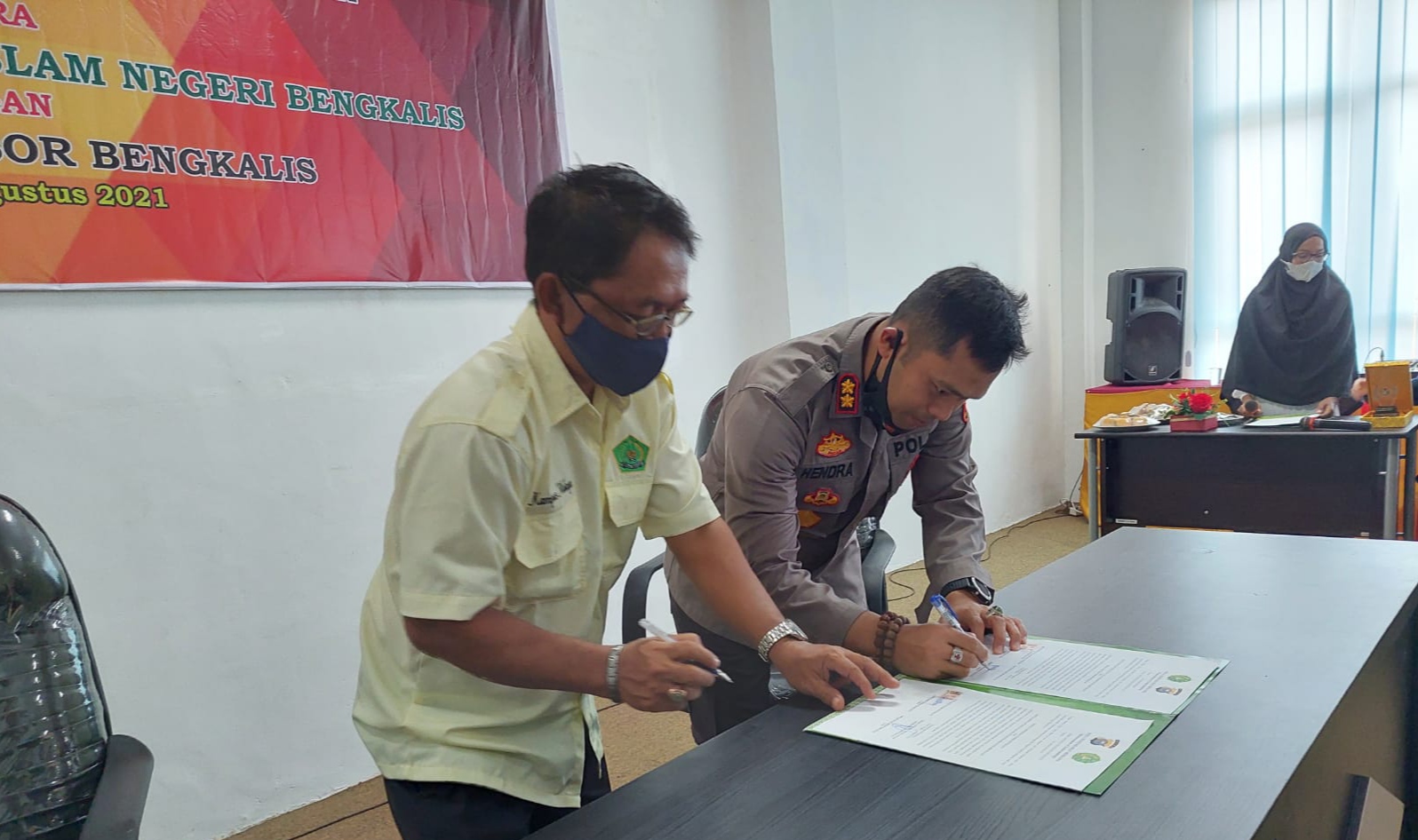 Hadir pada MoU tersebut Kapolres Bengkalis AKBP Hendra Gunawan SIK MT, Kabag Ops Polres Bengkalis Kompol Ahmad Salmi Ketua STAIN Bengkalis Prof Dr H.Samsul Nizar M.Ag, wakil Ketua STAIN Bengkalis, Wira Sugiarto SIP MPdi, wakil ketua I Dr Saiful Najar, Kaprodi Hukum keluarga Islam (HKI), Muhammad Al Mansyur, Kasubag Akademik Nadia Faika, Staf STAIN Bengkalis