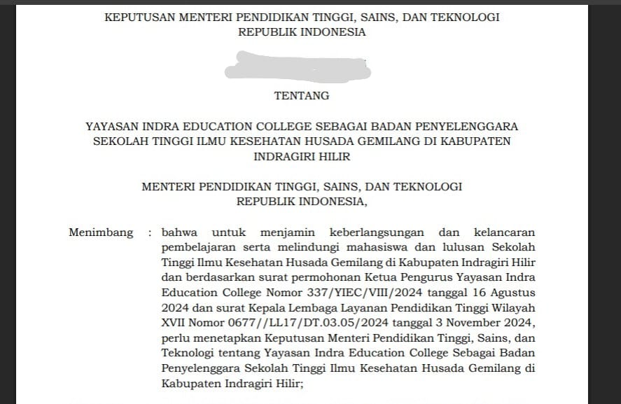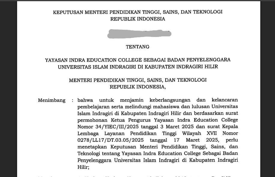 Nusaperdana.com, Indragiri Hilir — Yayasan Indra Education College mengumumkan bahwa secara resmi telah mendapatkan pengesahan sebagai Badan Penyelenggara Pendidikan dari Direktorat Jenderal Pendidikan Tinggi (Dikti), Kementerian Pendidikan, Kebudayaan, Riset, dan Teknologi Republik Indonesia, Jumat 08/08/2025.